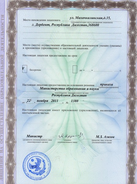 | Адрес местонахождения образовательной организации* | 368608, Республика Дагестан, г. Дербент, ул. Махачкалинская, 35 |